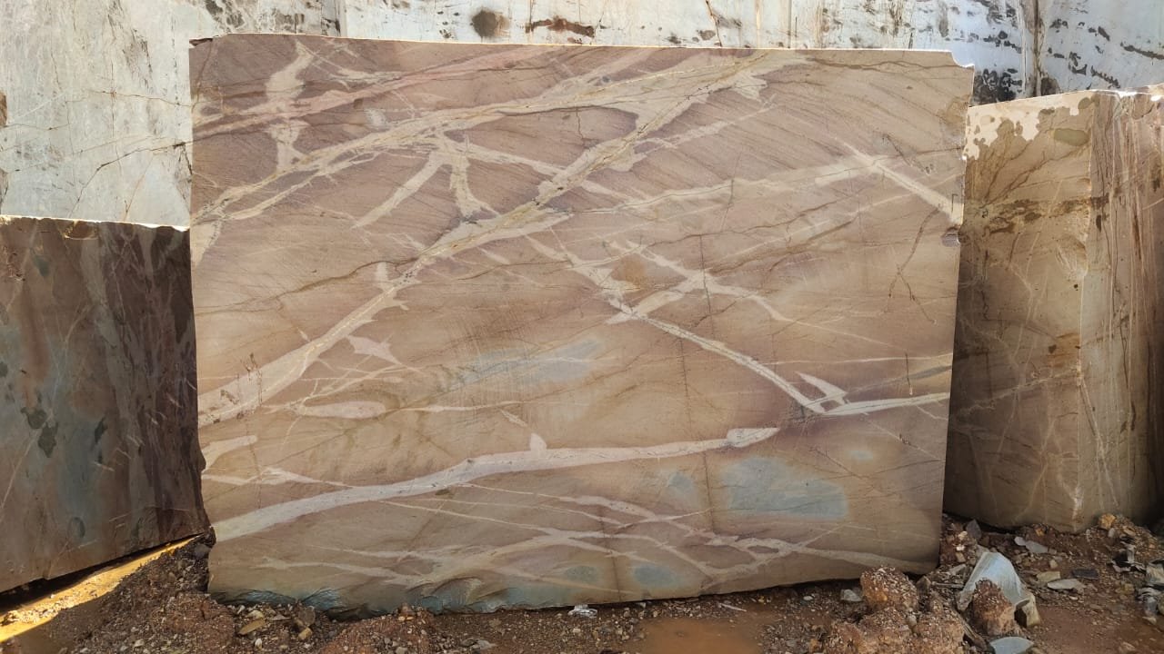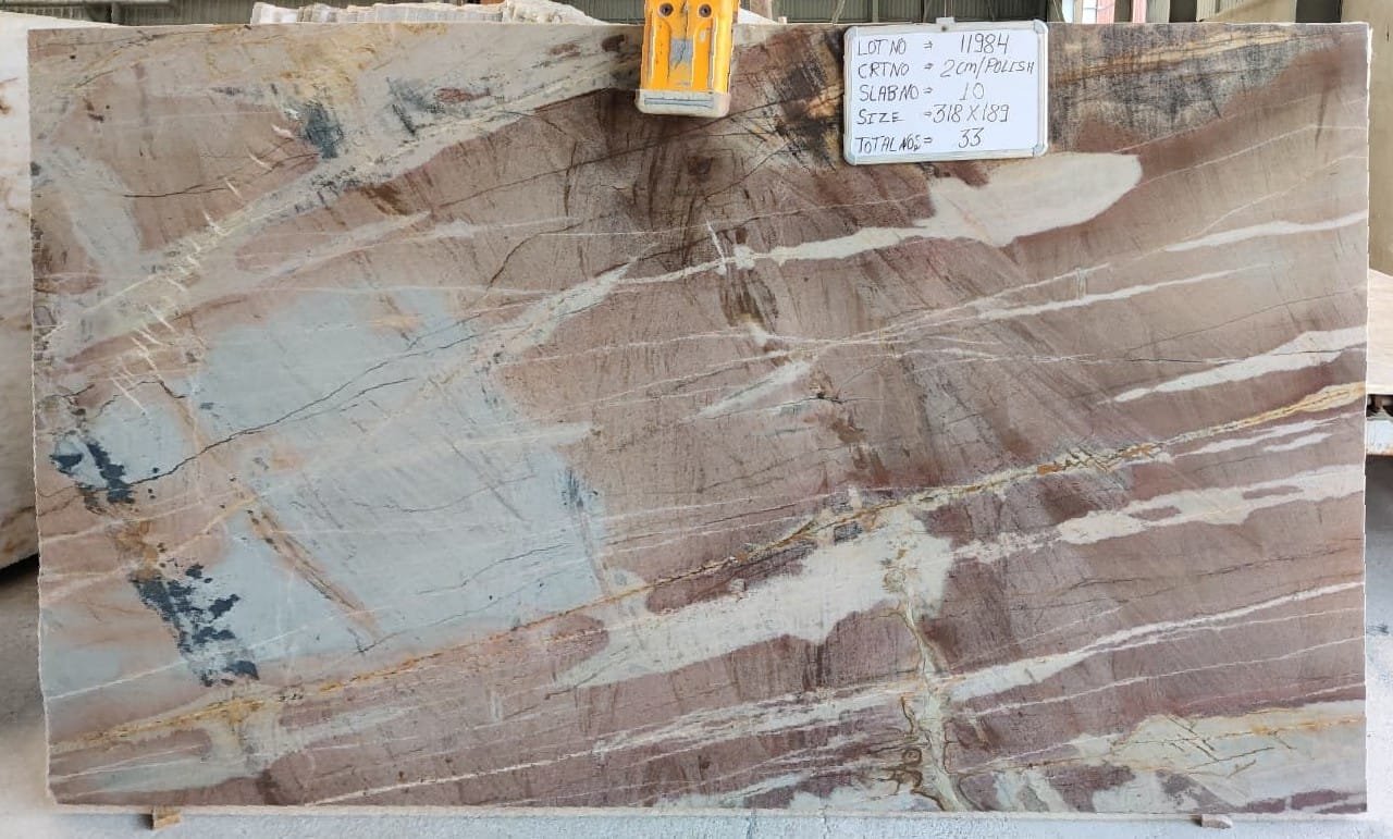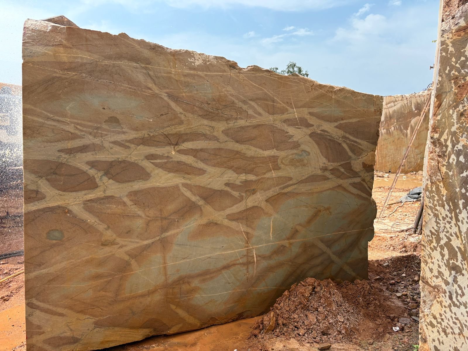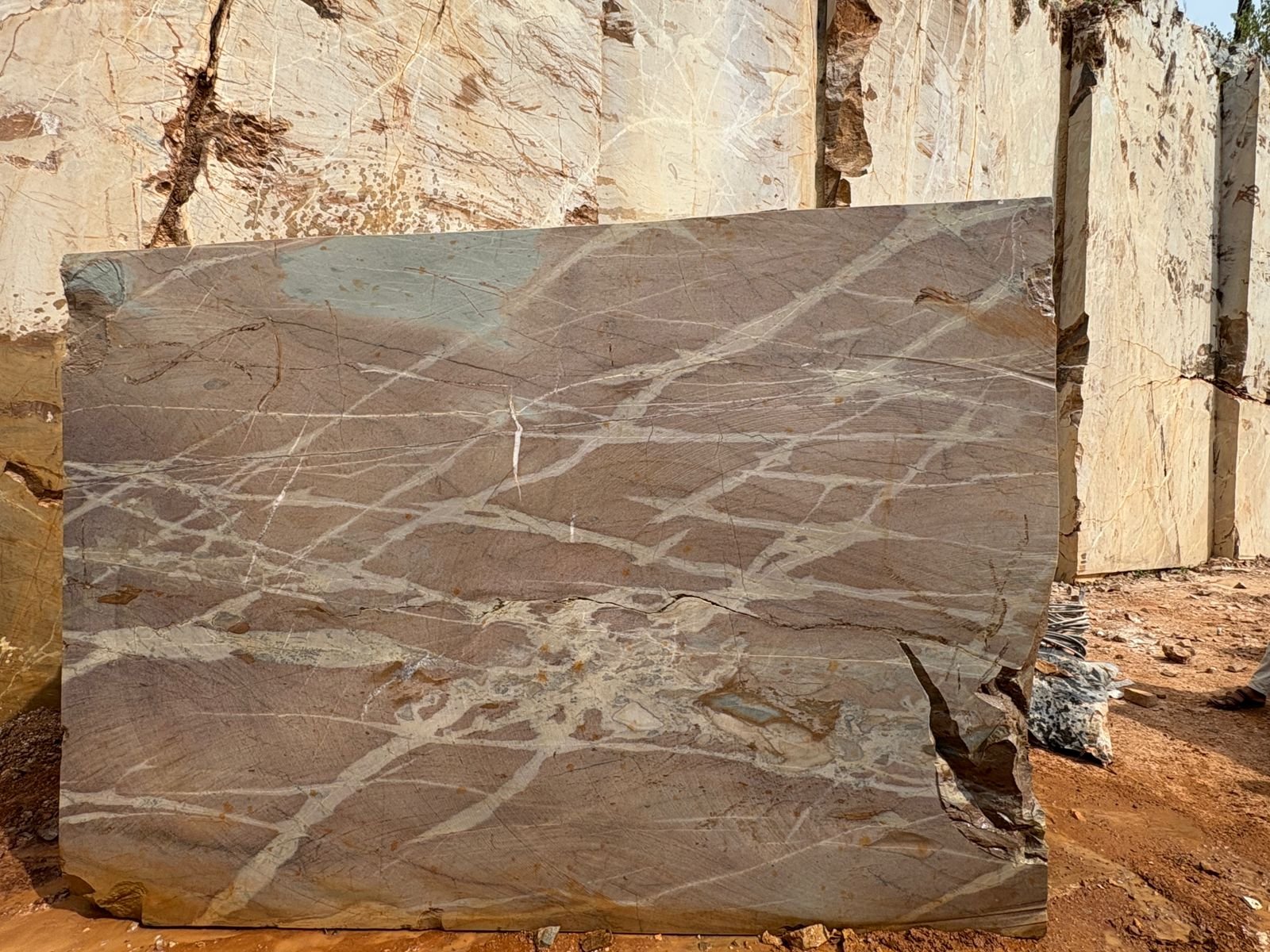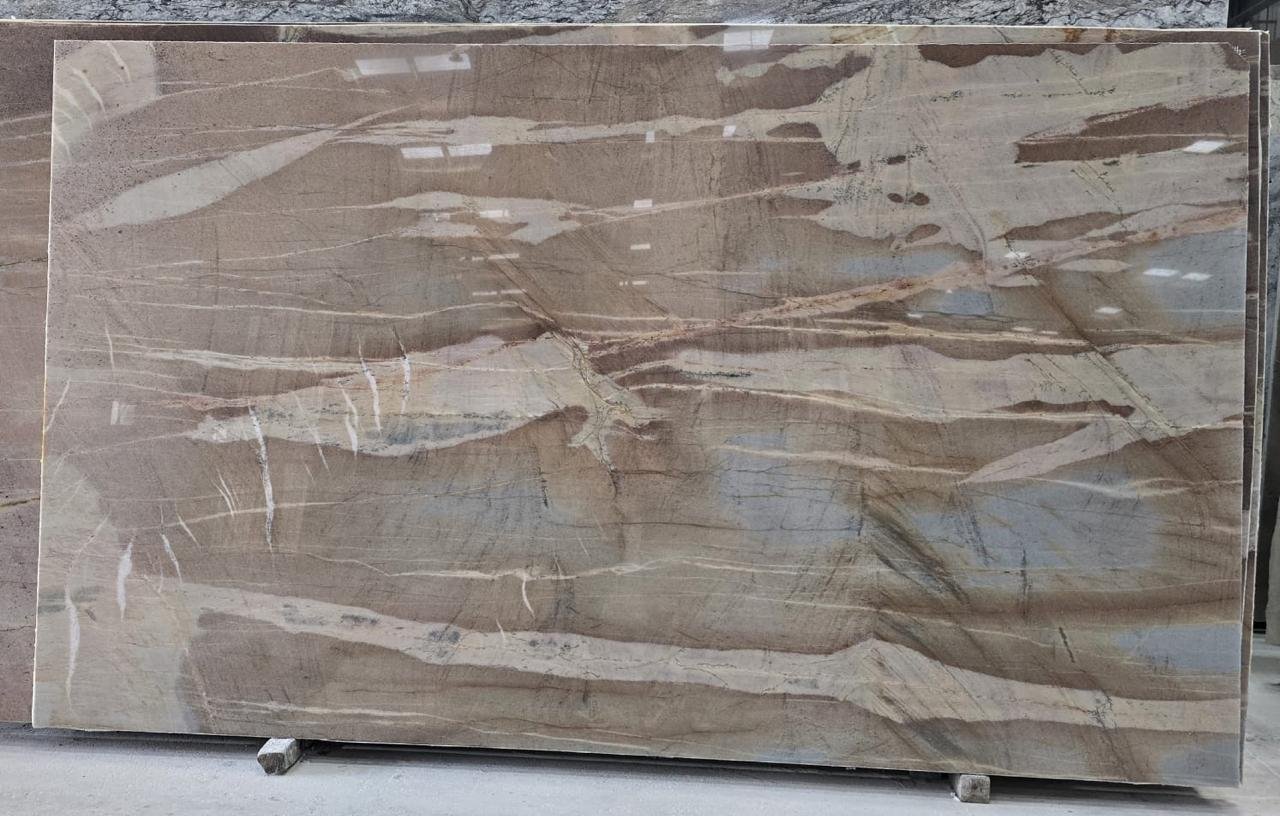 This exquisite quartzite slab showcases flowing layers of warm beige, sandy taupe, and soft cream tones, beautifully accentuated with subtle mineral veining and natural crystalline textures. The organic, landscape-like movement across the slab creates a sense of depth and natural artistry, making every piece truly unique. Its polished surface enhances the stone’s natural luminosity while maintaining the durability quartzite is known for.